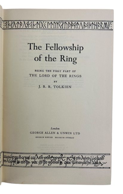 Tolkien, John Ronald Reuel. 1966-8 The Lord of the Rings. Three volumes. Containing The Fellowship of the Ring, The Two Towers and The Return of the King. Mixed impression set, comprised of The Fellowship of the Ring in the first edition, fifteenth impression, The Two Towers in the second edition, and The Return of the King in the second edition, third impression. London: George Allen & Unwin LTD. With the first edition dust wrapper design for The Fellowship of the Ring and the second edition dust wrapper design for the other two volumes. All dust wrappers are unclipped. (3)
