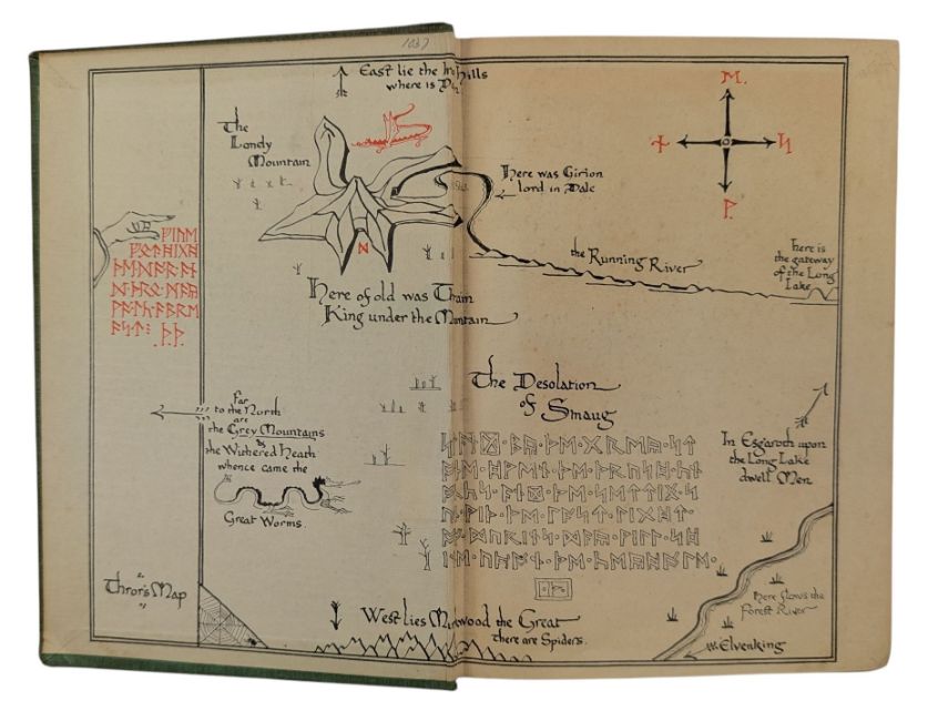 Tolkien, John Ronald Reuel. 1937 The Hobbit, or There and Back Again. The sought-after 'true' first edition, first impression of this celebrated fantasy novel from Tolkien. One of 1,500 printed, with statement "First Published in 1937" to the verso of the title page; map endpapers in red & black of Thror's Map and Wilderland, single leaf publisher's advertisements bound to rear. Lacking dust wrapper. Illustrated with ten black and white illustrations by the author in black and white. London: George Allen & Unwin Ltd. Bound in the publisher's green cloth with Smaug illustration to front board. (1)