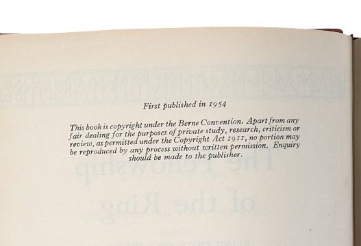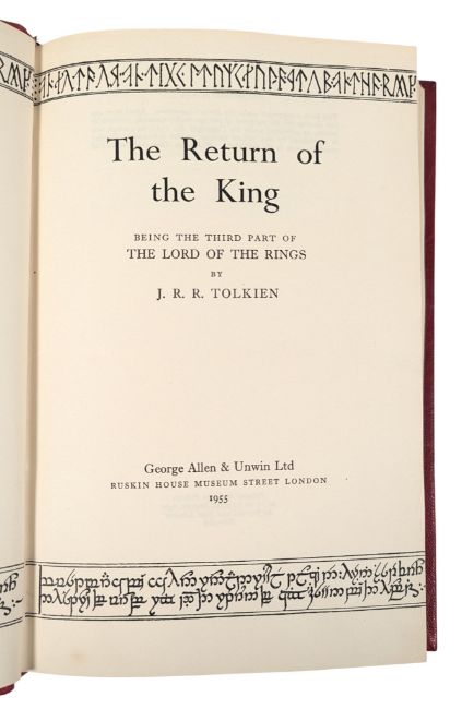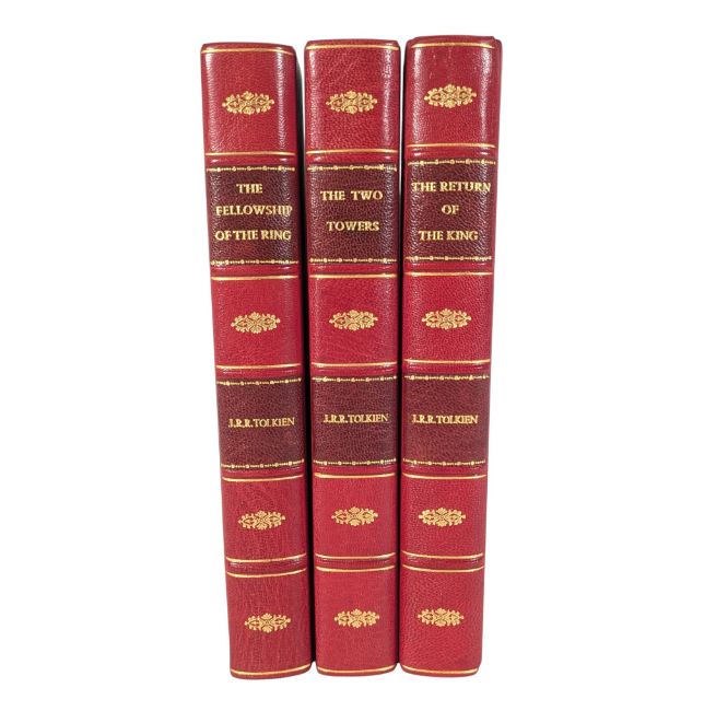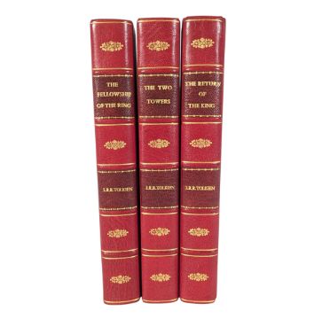 Tolkien, John Ronald Reuel. 1954-5, first edition, first impression The Lord of The Rings three volume set, comprised of The Fellowship of the Ring, The Two Towers and The Return of the King. The sought after first edition, first impression to each volume. The Return of the King is in the first impression, second state, with the number 4 to the corner of p49, with no later impressions stated. Re-bound in full red crushed morocco with raised bands and gilt tooling to the spines, with a detailed letter of provenance from our client, reading in part; 'My father read and reread them so many times that by the mid 1970s they were getting a bit shabby and so a friend who was learning book binding offered to rebind them'.