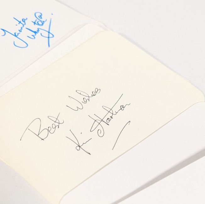 Autographs - a large collection of 100+ signatures, mostly unidentified. Known names include: Anthony Page, Billie Whitelaw, Kim Hartman, Louise Jameson, Ron Cook, Anna Calder Marshall, and Christopher Timothy. All obtained from the 1960s to the 2000s by John Short, whose collection included actors, authors, circus performers, wresters, speedway, singers and film stars. (100+)