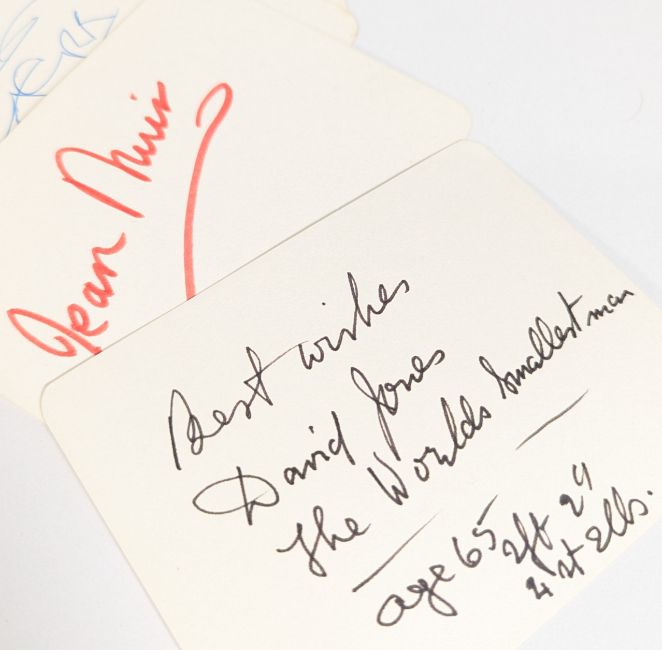 Autographs - a large collection of 100+ signatures, mostly unidentified. Known names include: David Haig, Vera Lynn, Denis Waterman, Yvonne Marsh, Sybil Thorndike, Gerry Marsden, Jean Muir, and David Jones 'The World's Smallest Man'. All obtained from the 1960s to the 2000s by John Short, whose collection included actors, authors, circus performers, wresters, speedway, singers and film stars. (100+)