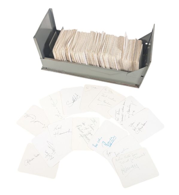 Autographs - 'H' - a large drawer of 600 signatures on white cards, all collected by John Short c1980s to the early 2000s. All with surnames beginning with 'H' and stored in alphabetical order. Largely actors, but some other genres of entertainment included, and all obtained mostly around Bristol / Bath during the period. Names of note within include: Barry Howard, Judy Holt, Sue Hodge, Sue Holderness, Jeffrey Holland, Patricia Hodge, Bernard Hill, Ruthie Henshaw, Charlton Heston, Nigel Havers, Nigel Hawthorne, Rolf Harris, Doris Hare, Gerald Harper, Keith Harris, Irene Handl, Terrence Hariman and many others. All with the details of when and where each was obtained. All cards 3.5" x 4.5". Qty estimated at circa 600.