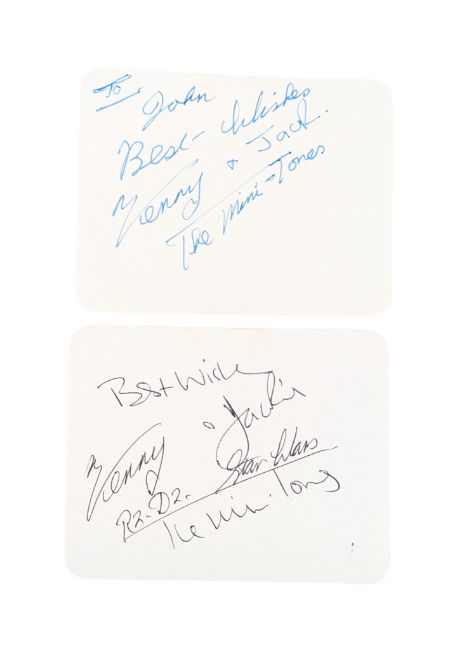 Star Wars interest - The Mini-Tones - autographs of Kenny Baker (d.2016) and Jack Purvis (d.1997) as 'The Mini-Tones', a musical variety act. Two 3.5x4.5" cards, both dual signed. One pre-Star Wars, the other obtained just after the release of the first film, in 1978.