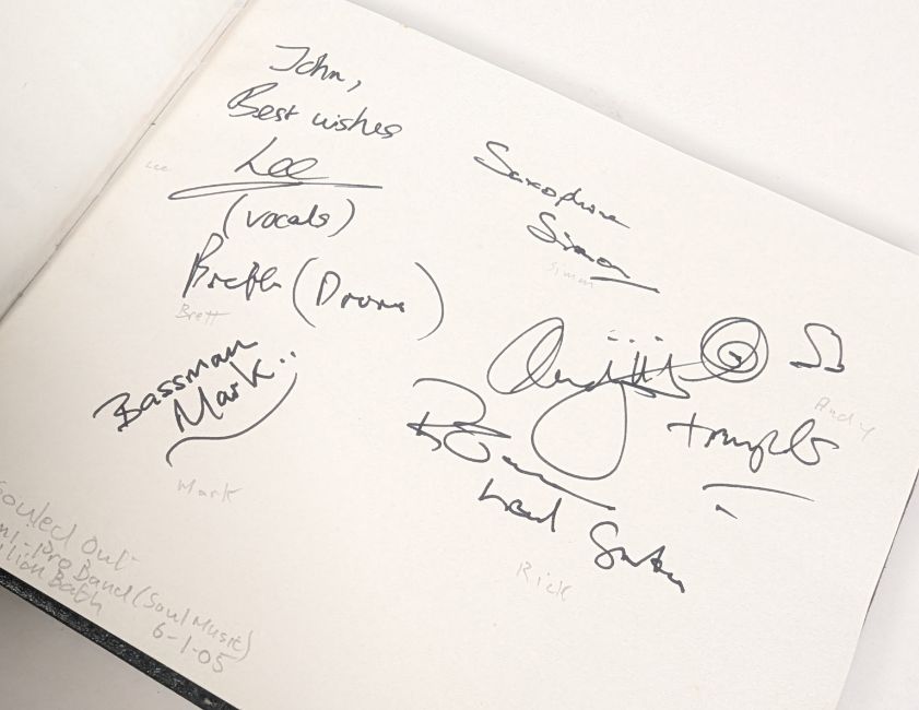 Autograph Albums - four albums of autographs obtained c2000s containing signatures from various entertainers; actors, singers, and entertainers. Names of note include: Souled Out, Bruce Nelson, Nobby Clarke, James Laurenson, Anna Carteret, Penelope Keith, Amanda Drew, Aden Gillett, Derek Hutchinson, and many others. Most signed on single pages, but the occasional back-to-back may be present. Many with pencil annotations noting the signer, some unidentified. Variously filled - two sparse. (4)