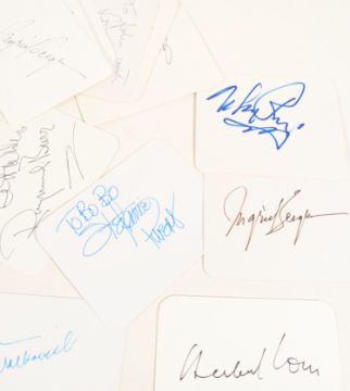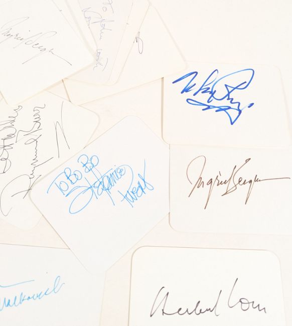 Hollywood - a large collection of assorted autographs from various Hollywood / Internationally-known actors. Includes: Bob Hope, Anthony Hopkins, Sophia Loren, John Malkovich, Ingrid Bergman (x3), Jackie Mason, Herbert Lom, Stockard Channing, Raymond Burr, Stephanie Powers, Robert Wagner, Mickey Rooney (x2), Richard Drefuss (x2), Charles Napier, Elizabeth Taylor, Ingrid Pitt (x2), Stewart Granger, Colin Farrell, Douglas Fairbanks Jr (x2), Colin Firth (x2), Daryl Hannah (x3), Rex Harrison (x2) Charlton Heston (x2) and Bob Hoskins. Many with the location and date of signing to the rear. Largely undedicated, but some with dedications. (35)