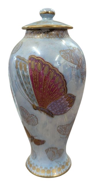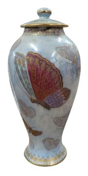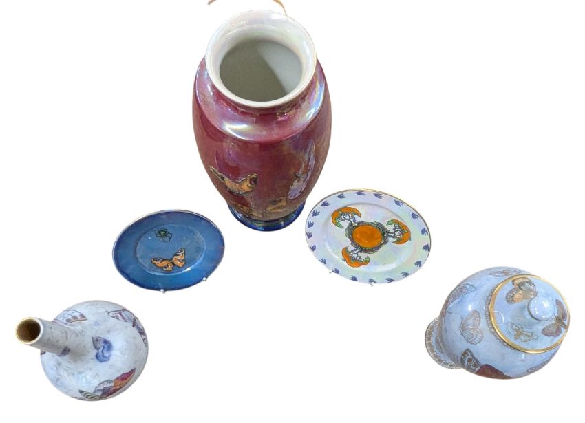 Five hand-painted ceramic pieces, to include an Armand lidded baluster vase (af), a butterfly and spider dish, a fairyland dish, a large vase, together with another