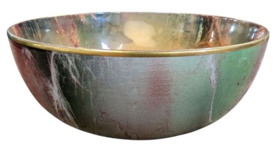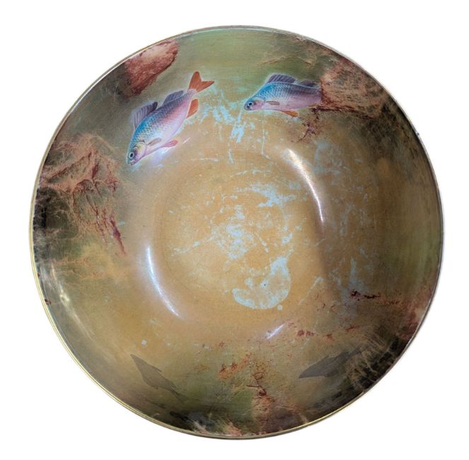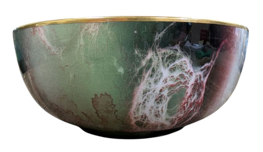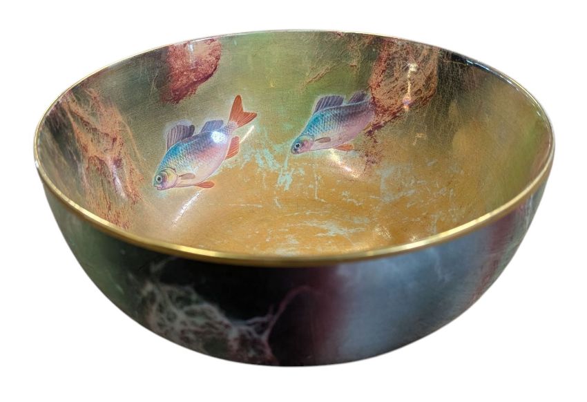 Bowl with green and orange veined and smoked pattern in a lustre finish with fish motifs