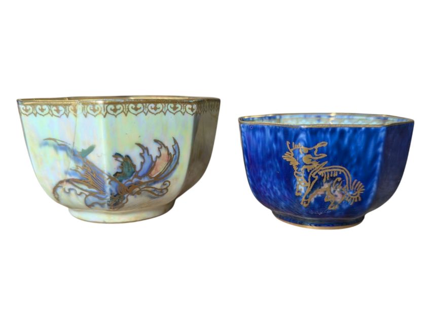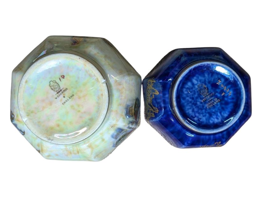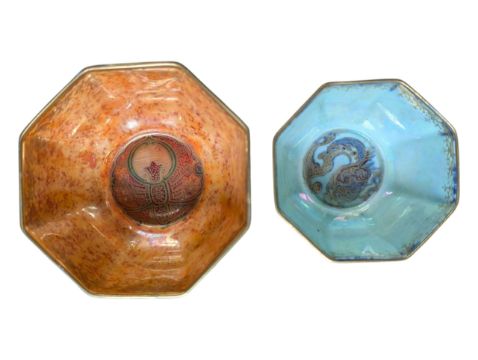 Two lustre finish octagonal miniature bowls. Butterfly motifs on orange ground, together with a smaller blue & purple ground dragon bowl.