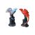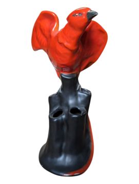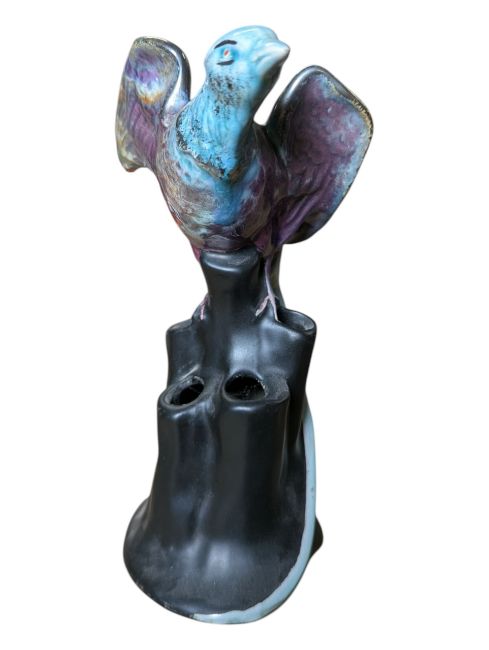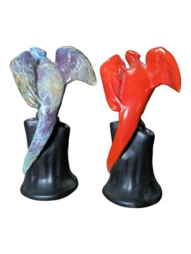 Two ceramic statues in form of phoenixes, one in orange glaze and in green & purple glaze