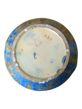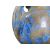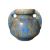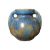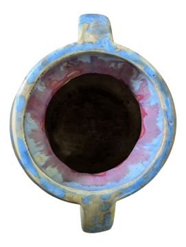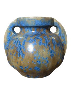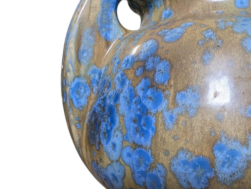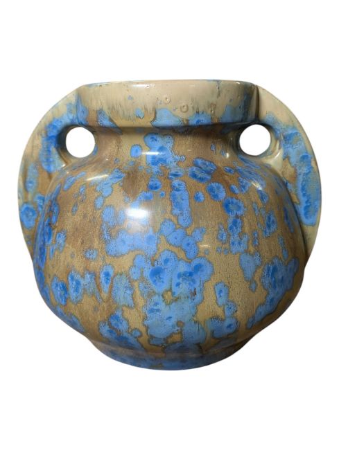 In a mottled blue and brown crystalline glaze finish with twin handles