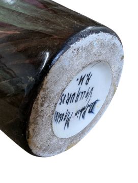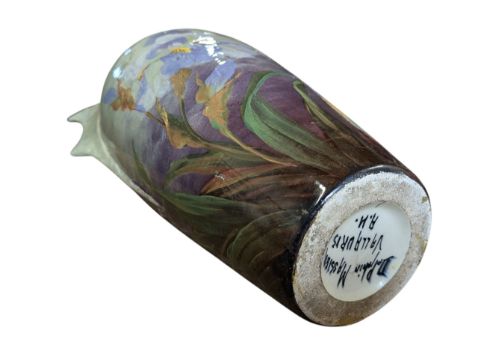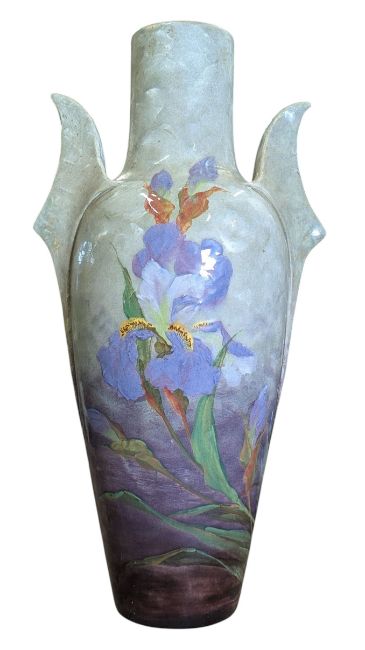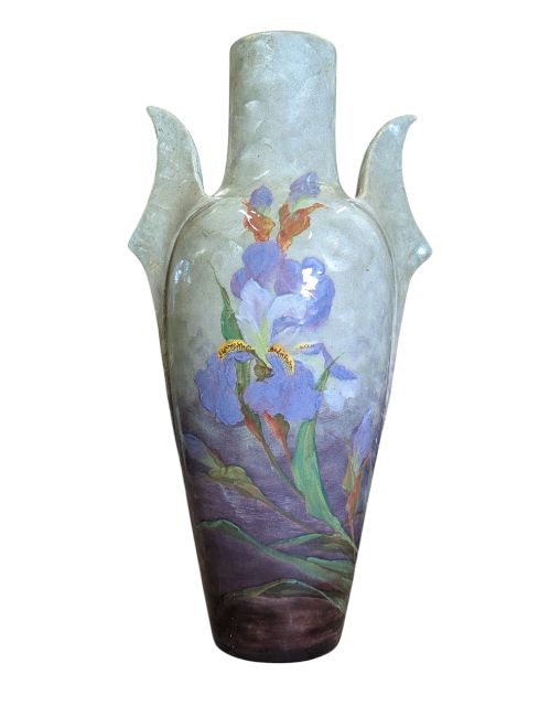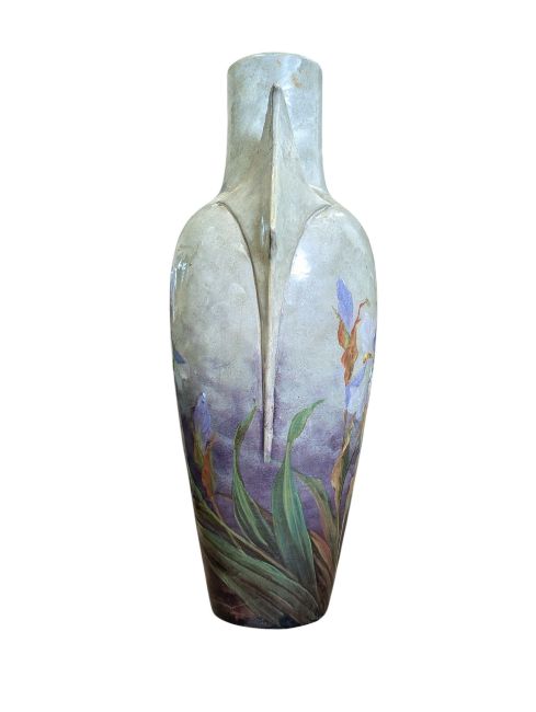Art Deco baluster vase decorated in light olive ground and purple flowers with shaped twin handles