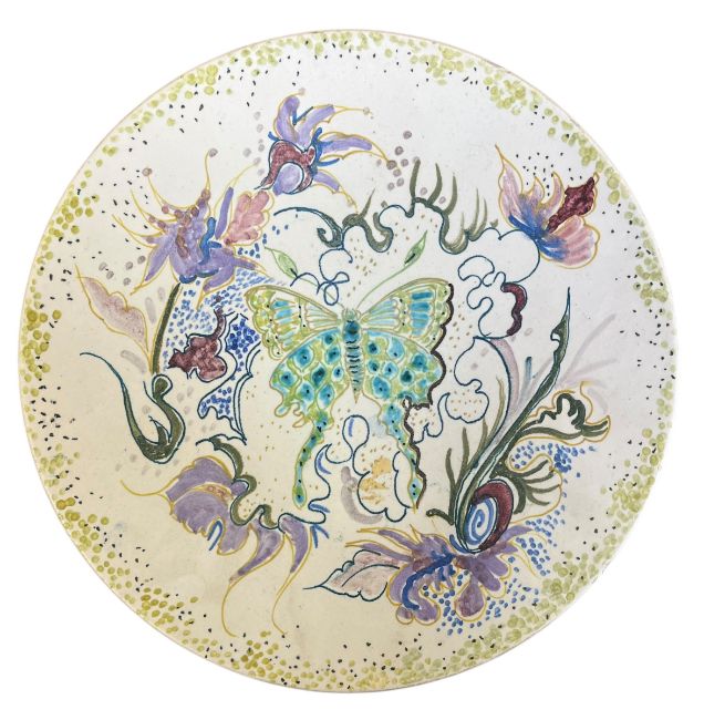 An hexagonal ginger jar vase decorated with floral & foliate motifs on cream ground. A wall charger plate decorated with butterfly and flowers on white ground