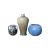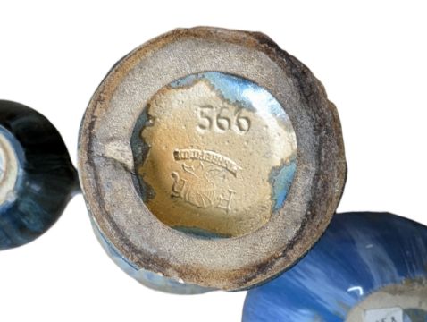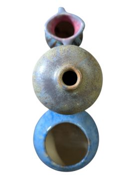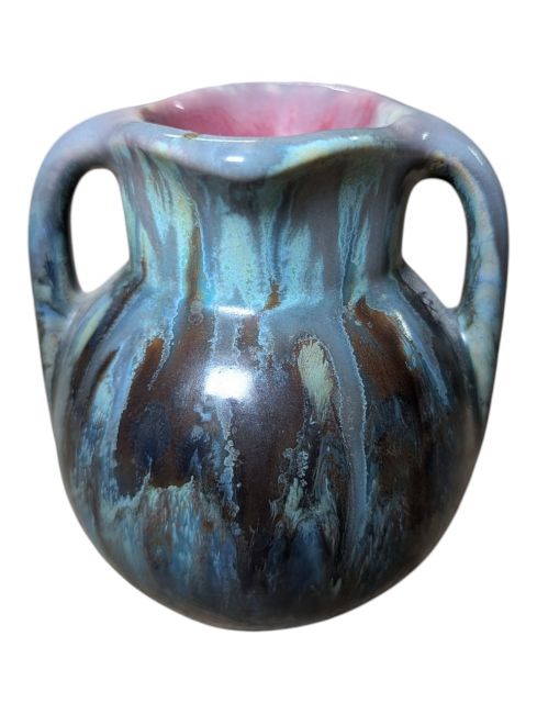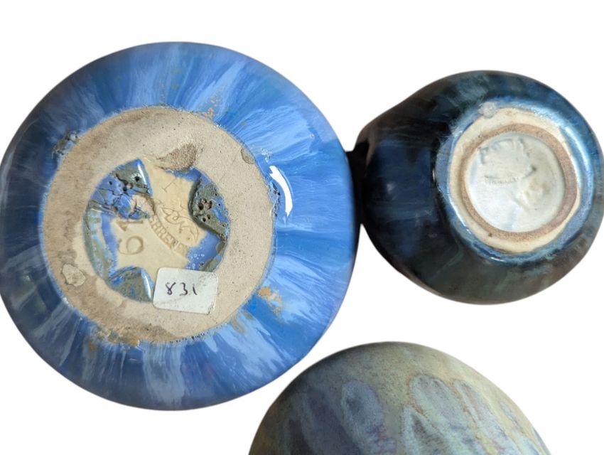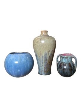 Green/brown baluster vase in overall good codnition with chips to foot, no cracks or restorations. Blue bulbous vase in overall good condition, no signs of cracks, chips or crazing, signs of burst air bubbles from firing. Twin handled miniature vase in overall very good condition, no signs of chips, cracks or restoration.