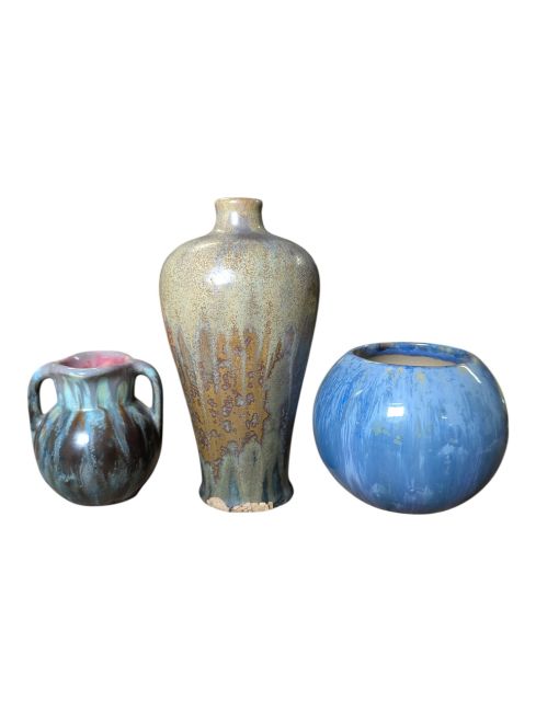 Three assorted mottled & crystalline glazed vases of various shapes and sizes