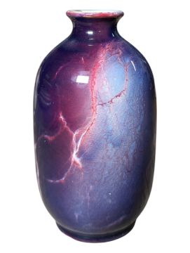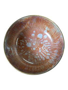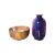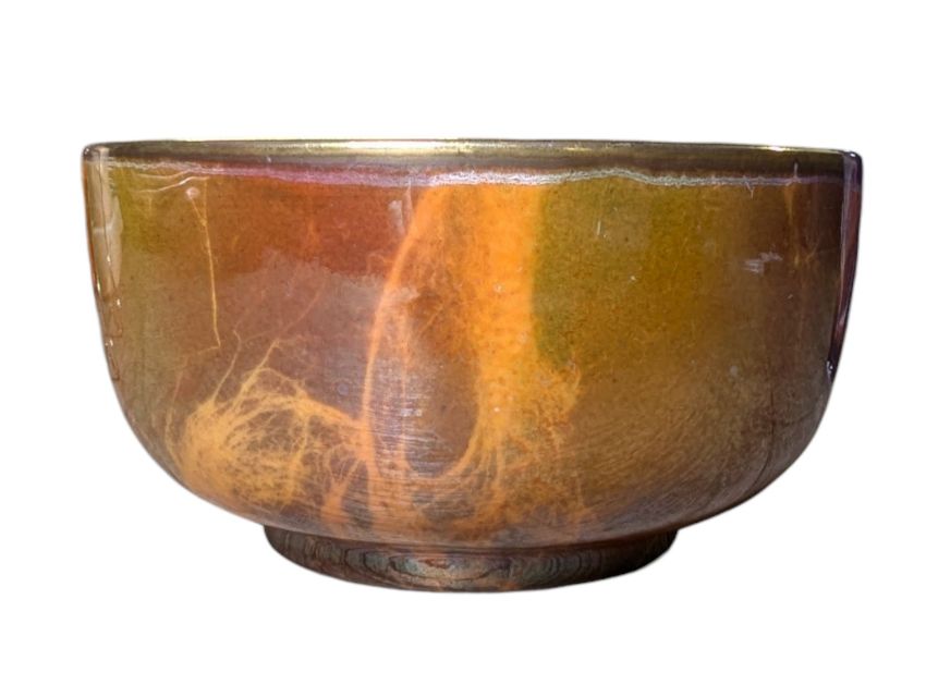 A bowl and vase with purple & pink veined and smoked pattern, and orange & brown veined & smoked pattern in a lustre finish
