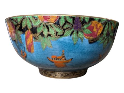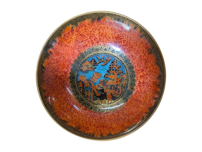 Red, orange & blue ground with gilt decorations of boats and birds, pagoda decoration to inside of the bowl