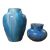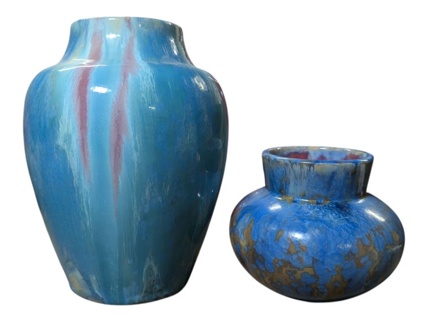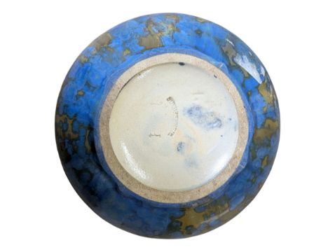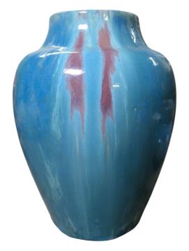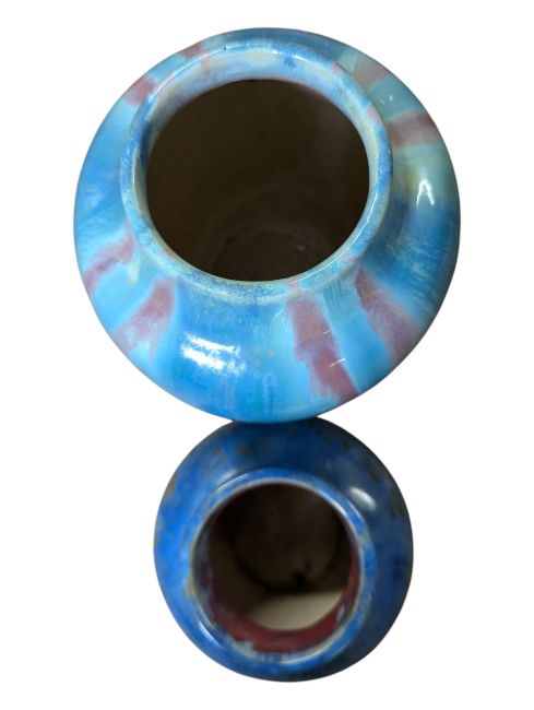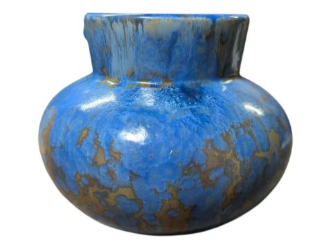 In a mottled blue and brown/pink crystalline glaze finish