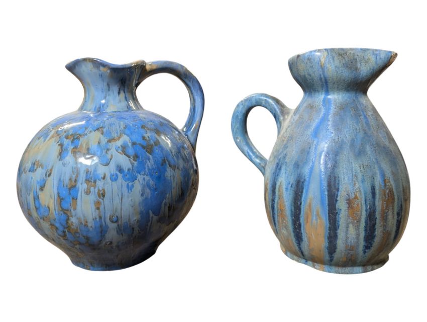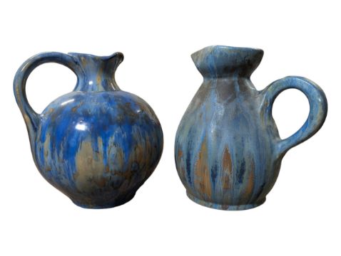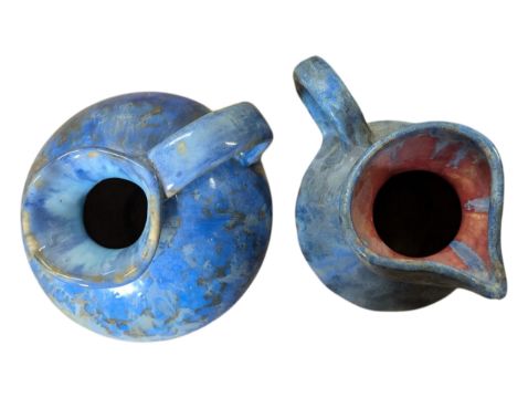 Overall good condition. Blue round jug in very good condition with no visible chips, cracks or repairs. Pink & blue jug with restoration mark to base of handle and small chip to spout.