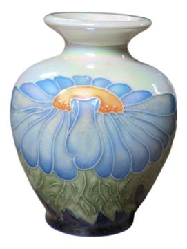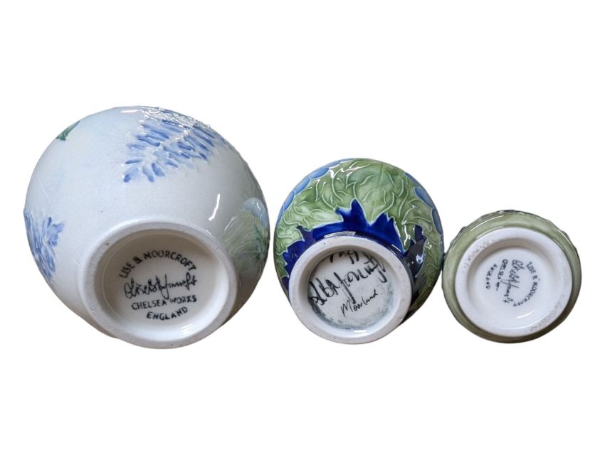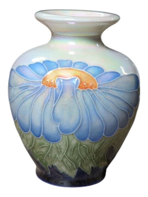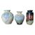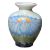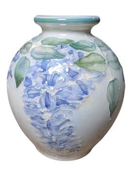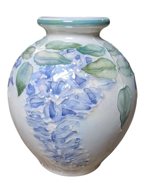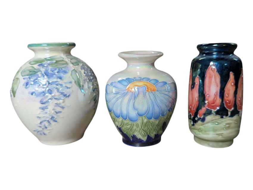 Three baluster-shaped vases in lustre finish with lilac wisteria, and blue & yellow daisies, and midnight trees