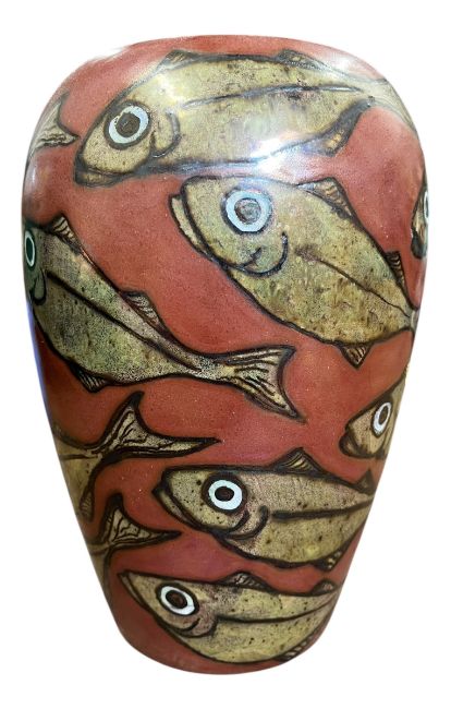 Hand-painted lustre detailed ceramic baluster vase with fish on maroon ground