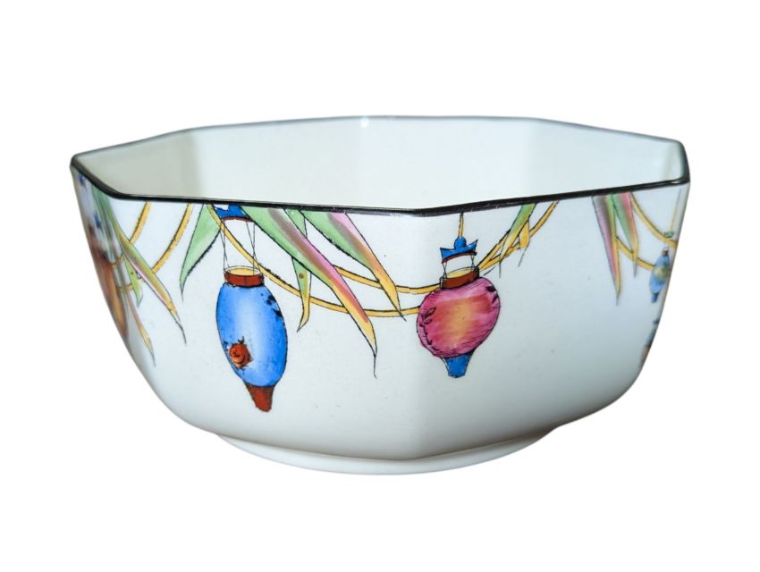 Various bowls with Chinese lanterns & leaves motifs, some lustre finish. One plate with similar decoration on a black ground.