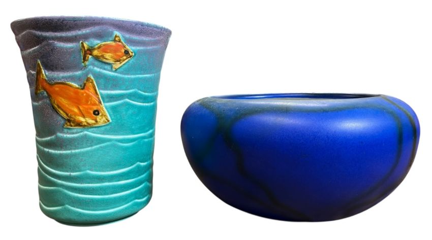 Two hand-painted pottery vases, to include a flared neck straight vase with fish motifs, together with a blue marble effect lipped bowl