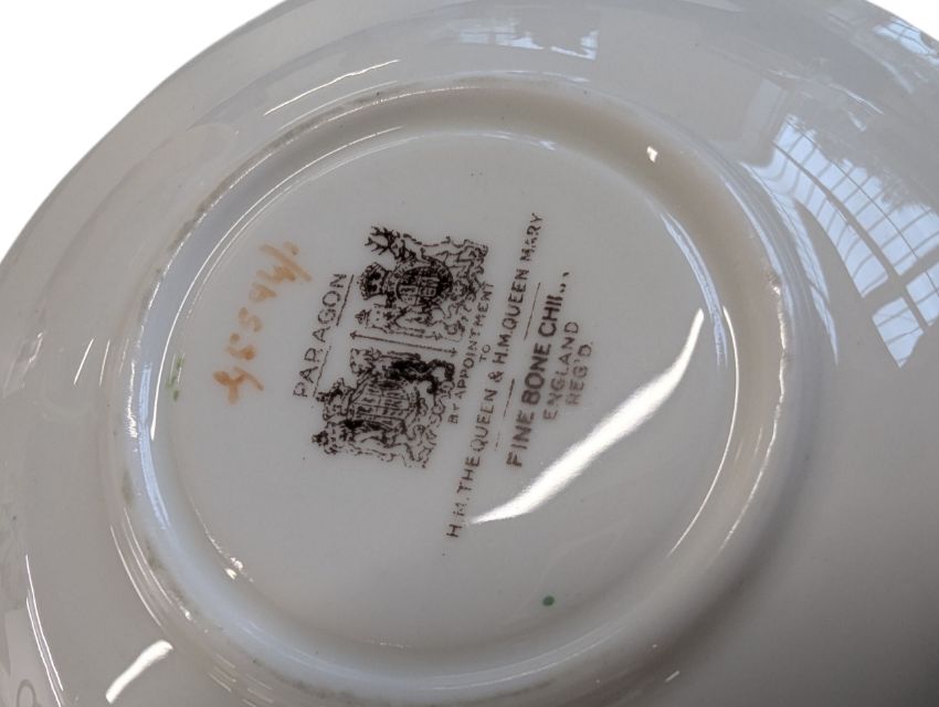Early 20th century Clarice Cliff pottery jug accompanied by a Paragon tea cup and saucer, and a Crown Staffordshire coffee cup and saucer. Clarice Cliff jug decorated in the Secrets pattern. Crown Staffordshire coffee cup and saucer decorated in a green swags / ribbon and roses. Largest measuring approx. 14cm tall. Sold as seen.