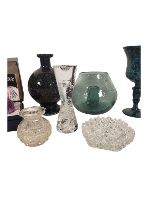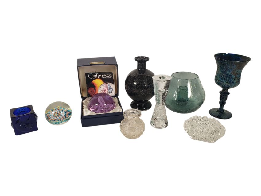 Studio Art Glass - A collection of vintage 20th centruy studio art glass, including Caithness Paperweight in box, Finnish Iittala Arkipelago hour glass vase, large bulbous vase with candle holder, globular stem bud vase, mottled blue goblet vase and some cut glass examples.