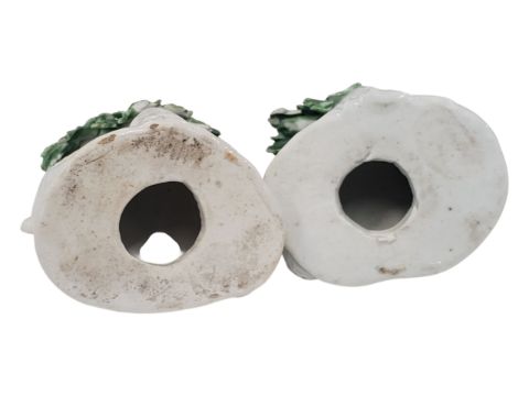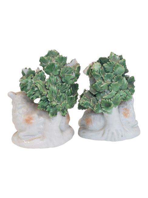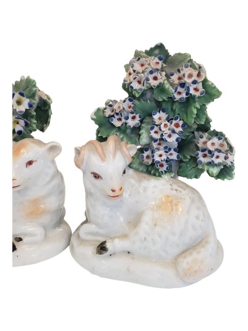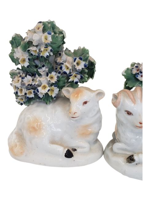 A pair of 18th century Staffordshire porcelain china lambs / sheep figurines. Hand painted / crafted with enamelled flower / leaves to top and then sheep / ram in a reclined position. Sold as seen.