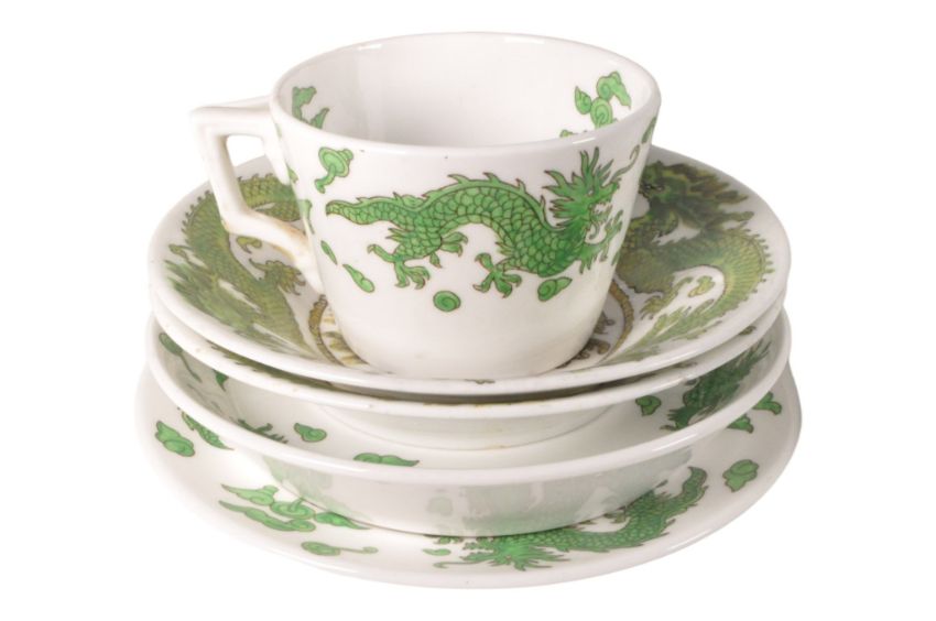 Hammersley and Coalport - Early 20th century c. 1920s bone china part tea service. Features a mixture of Hammersley and Coalport marked pieces, comprising of tea cups, saucers, milk jug, tureen, plates, and shallow bowls. All pieces decorated with a green coloured dragon design. Sold as seen.