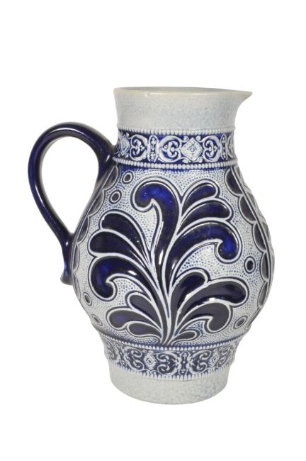 West German mid century ceramic jug with cups / lemonade set. Comprising of large water jug, with six matching handleless cups. Featuring floral relief in a blue field with a white mottled background. 3320 / 15