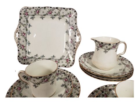 Fenton China - Valencia pattern - comprising of teacups, saucers and plates (with spares) and two sandwich / biscuit plates.