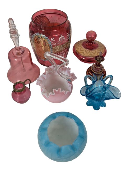 A collection of 19th century and early 20th century coloured glassware. To include a Venetian gilded lidded biscuit jar, a Sowerby art deco Pandora's box vase, a collection of cranberry glass, perfume bottles, a Jozefina Krosno jelly fish compote bowl, and a collection of vaseline glass. Largest measuring approx. 22.5cm tall.