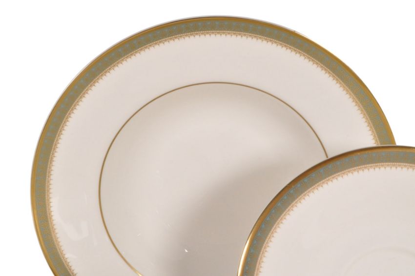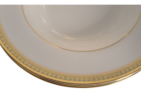 Royal Doulton - Late 20th century bone china part dinner service in the Clarendon pattern H4993. To include pasta bowls, twin handled cups / bowls and saucers. Maker's marks to the base.