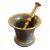An 18th century brass pestle and mortar. Having flared rim to top with rounded stepped base. Featuring shaped pestle with rounded ends.
