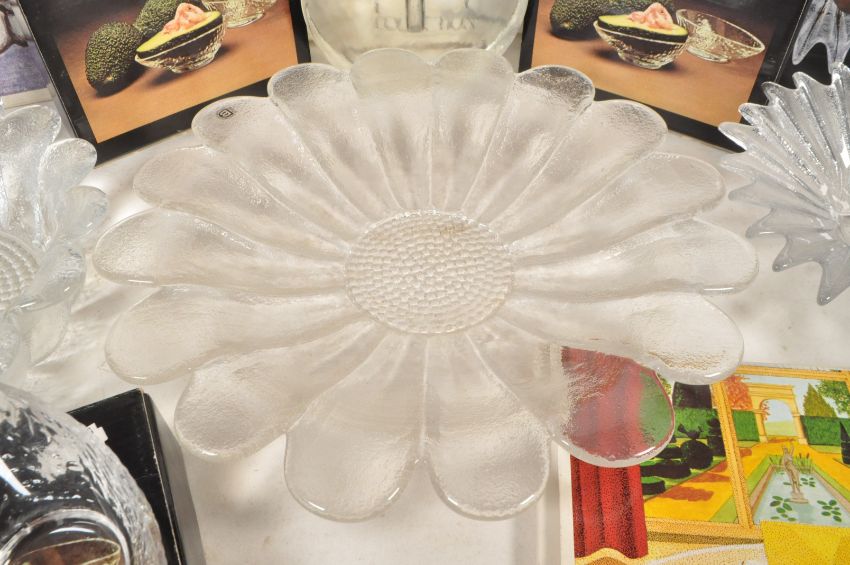 A collection of vintage 20th century boxed Dartington studio art glass. The collection featuring three boxed sets of Frank Thrower for Dartington FT137 Avocado Dishes, a FT214 Butter Platter, a FT215 Cheese Platter, a FT186/5 Large Shallow Bowl, a FT207 Fruit Platter, a Ripple Vase box, containing an unmarked plain glass vase, alongside an Anita Harris designed AH364 One Small Serving Dish, and a mid century Solifleur studio glass vase.