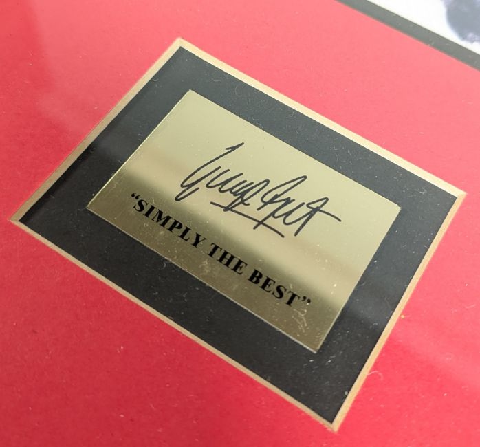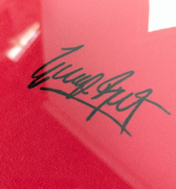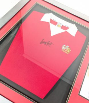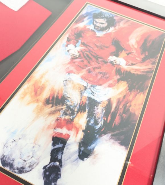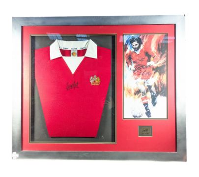 Football - George Best (1946-2005) - autographed replica Manchester United shirt. Signed in black ink to the centre, undedicated. Professionally framed and glazed alongside an art print of Best with a small plaque 'Simply The Best'. Obtained from an official signing event. Framed and glazed, total size: 85cm x 103cm. Some marks to frame.