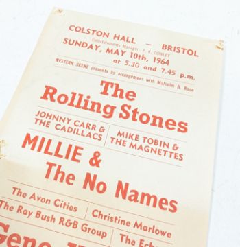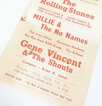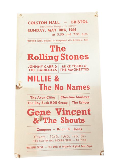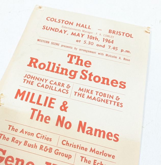 The Rolling Stones (English Rock Band Formed 1962) - Bristol Colston Hall - original handbill / flyer for a concert on Sunday May 10th 1964 featuring The Rolling Stones, Mille & The No Names, Gene Vincent and others. Some discolouration, pin holes to corner and centrally. Not folded. Obtained by the vendor at the concert. 21cm x 12.5cm.