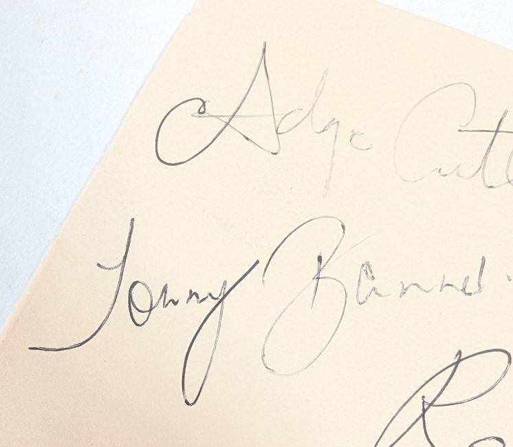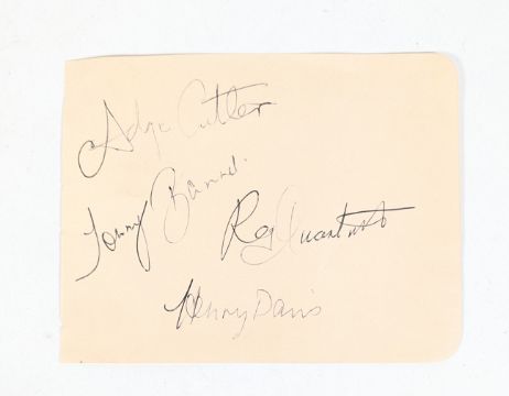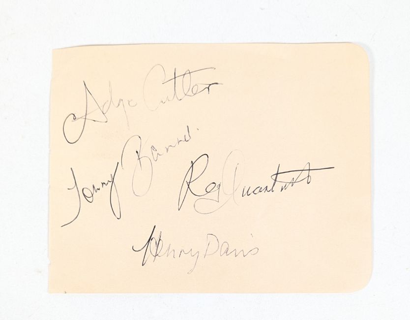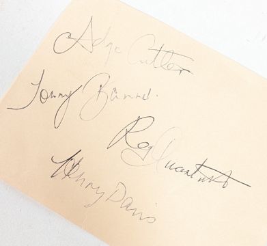 The Wurzels (English Scrumpy and Western band from Somerset) - early autographs on an album page signed in blue ink. Adge Cutler, Tommy Banner, Reg Quantrill and Henry Davies. Undedicated. 13cm x 17cm.