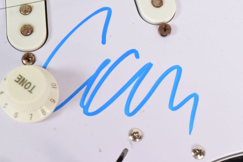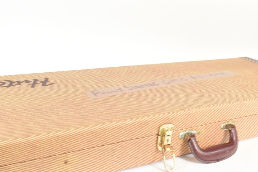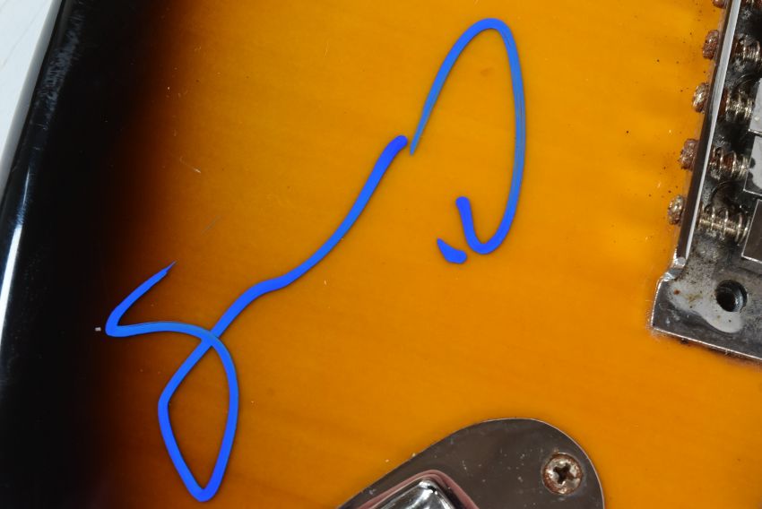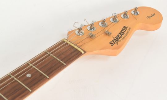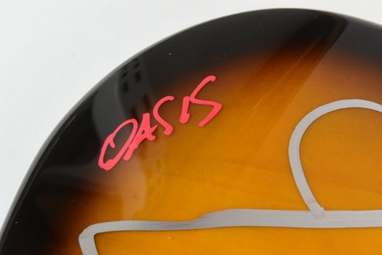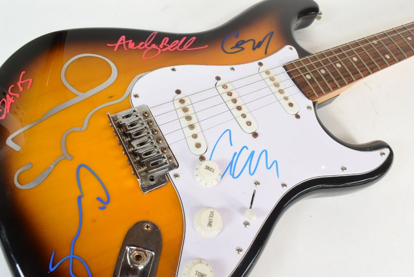 Oasis (English rock band formed in Manchester in 1991) - a rare full-band autographed Fender Starcaster electric guitar. Signed by: Liam Gallagher, Noel Gallagher, Andy Bell, Gem Archer, and Chris Sharrock. Bell adding the band's name to his signature. All signed to the guitar body, and to the pickguard by Liam. Sunburst finish, housed in a hard carry case. A labour of love for the vendor, this guitar was carried the length and breadth of the country in the 2020s to obtain each autograph, with a list of the locations it was signed. Comes with AFTAL authentication, with video and photographic proof available (by request). Guitar appears in near-mint condition. Special piece of Oasis memorabilia.
