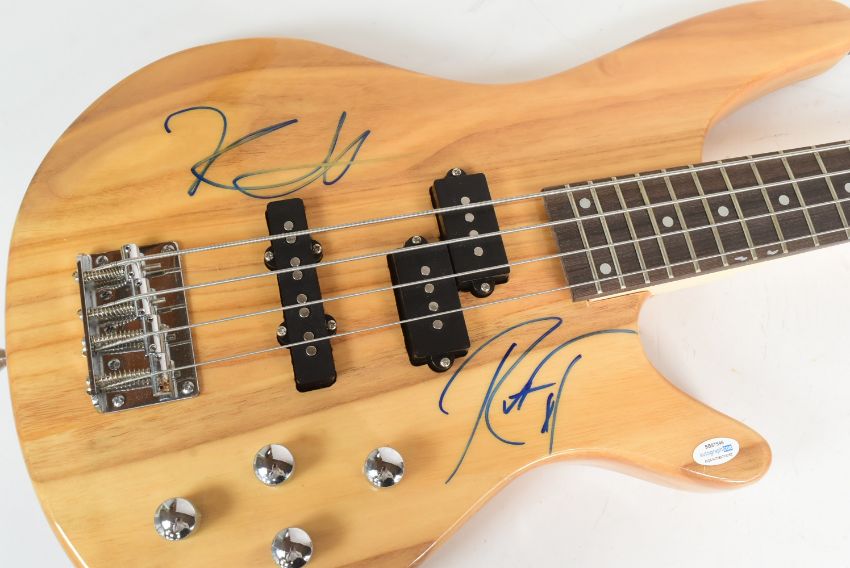Metallica (American heavy metal band) - Kirk Hammett & Robert Trujillo - dual autographed full size bass guitar. Signed to the body by both in blue ink, undedicated. Guitar appears as new. AutographCOA authentication #SB87546.