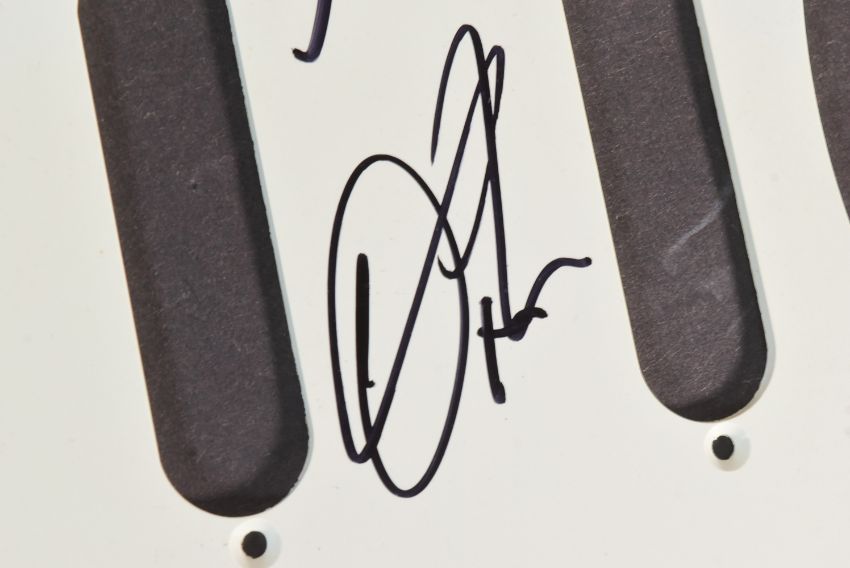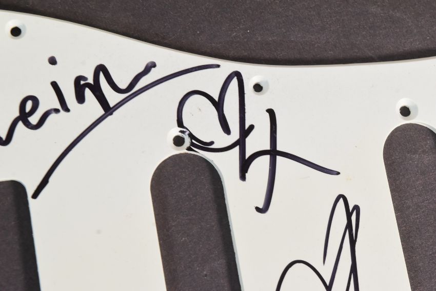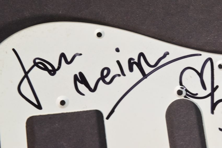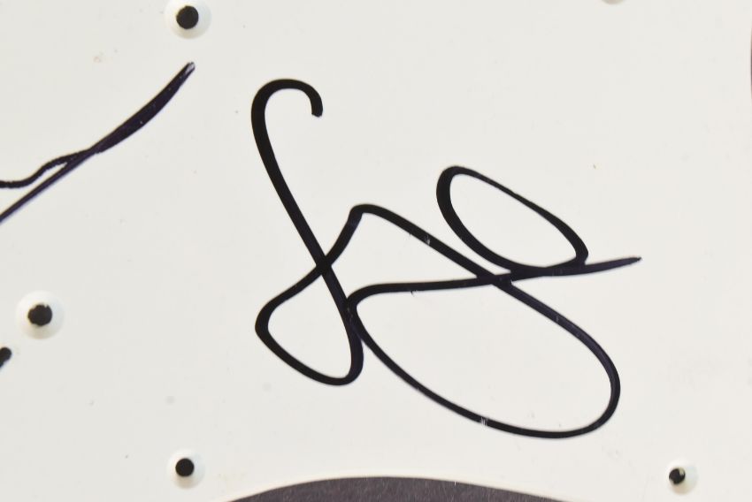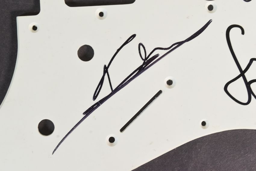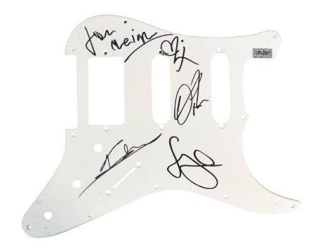 Kasabian (English rock band) - a Stratocast style electric guitar pick guard signed by Sergio Pizzorno, Chris Edwards, Ian Matthews and Tim Carter. Each signed in black ink, undedicated.
