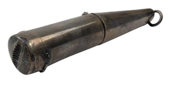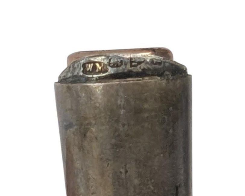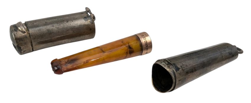 An early 20th century Edward VII amber cheroot holder in a silver match / striker case. Date mark rubbed. Sponsors mark for W M. The amber mounted in 9ct gold, Hallmarked year 1905, Birmingham. Sponsors mark for Joseph Gloster. Total gross weight approx 21.6g (silver case 28g).