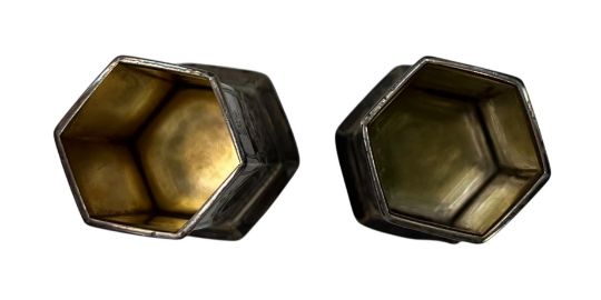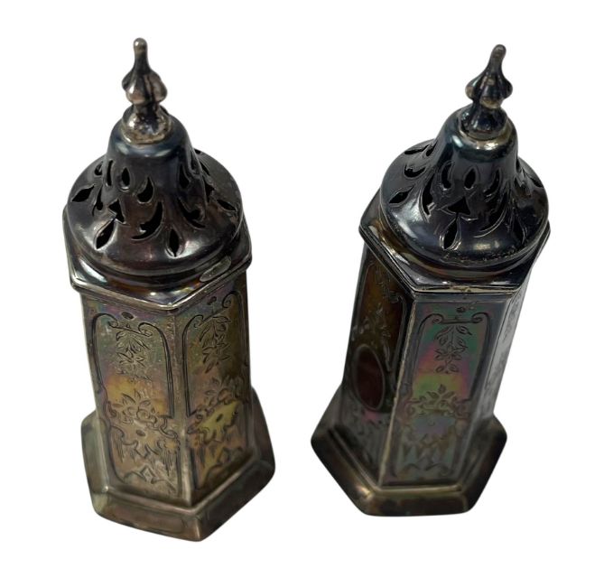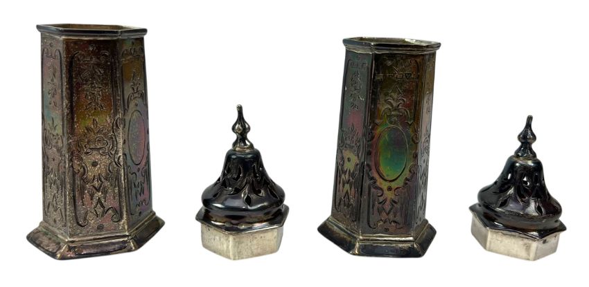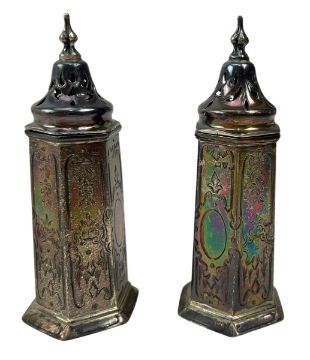 A pair of Edward VII hallmarked silver pepperettes with chase decoration. Hallmarked year 1908, Chester. Sponsors mark for S Blanckensee & Son Ltd (?). Total weight approx. 89g.