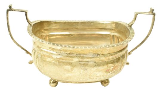 A George V hallmarked silver sugar bowl and creamer set. Hallmarked year 1918, London. Sponsors mark for Harrods Ltd, London. Together with George V hallmarked silver creamer. Hallmarked year 1920, Birmingham. Sponsors mark for S Blanckensee & Son Ltd. Total weight approx. 439g.