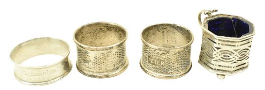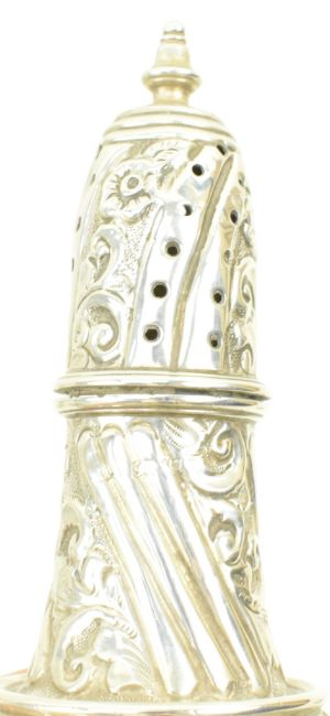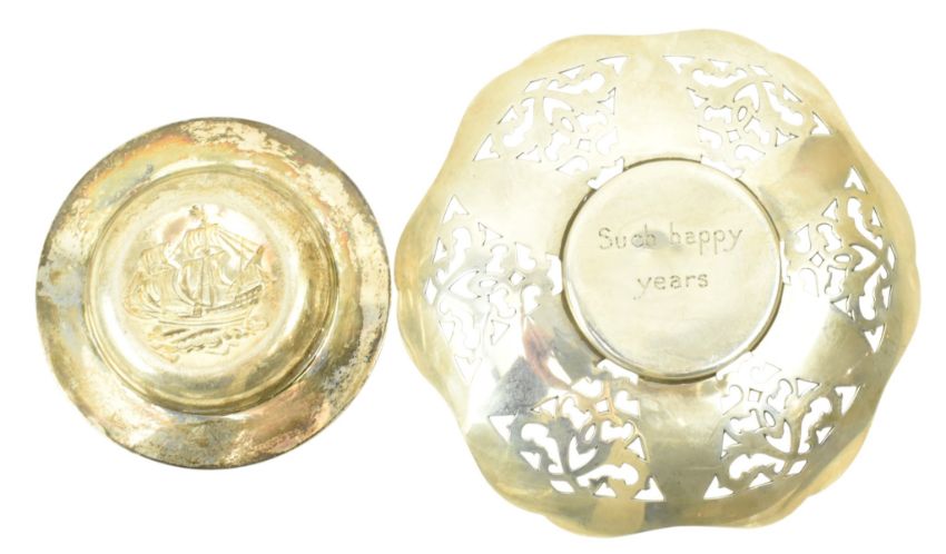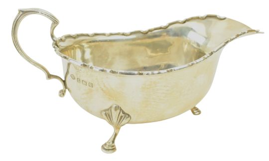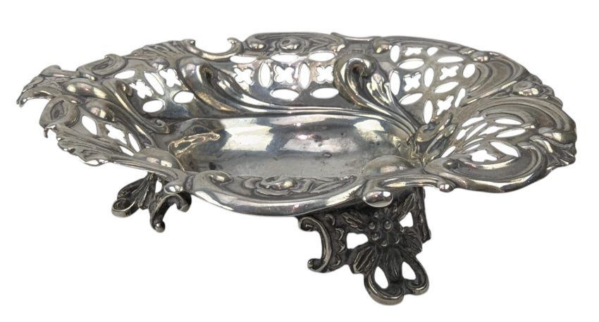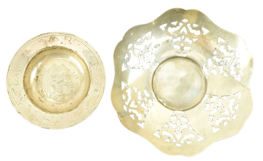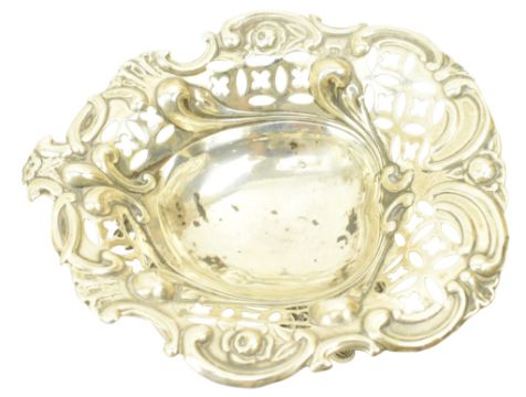 A 19th century Victorian hallmarked silver bon bon dish. Hallmarked year 1895, Sheffield. Sponsors mark for William Hutton & Sons Ltd.Together with a Victorian hallmarked silver mustard & blue glass lined reticulated mustard pot. Hallmarked year 1895, Birmingham. Sponsors mark for Cornelius Desormeaux Saunders & James Francis Hollings (Frank) Shepherd. Further together with a George V hallmarked silver sauce boat. Hallmarked year 1929, Birmingham. Sponsors mark for Adie Brothers Ltd. Along with an Elizabeth II hallmarked silver bon bon dish. Hallmarked year 1962, Birmingham. Sponsors mark for Lanson Ltd. Further along with an Elizabeth II hallmarked silver bon bon dish. Hallmarked year 1969, London. Sponsors mark for C J Vander Ltd. In addtion, a hallmarked silver sugar sifter / castor. Marks are rubbed. Total gross weight approx. 399g.