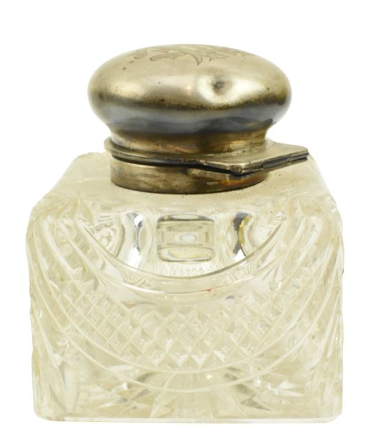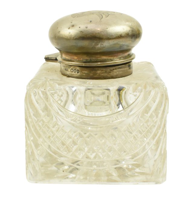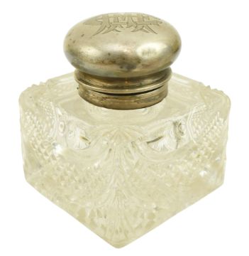 A 19th-century Victorian hallmarked silver & cut glass desk top inkwell. Engraved monogram to the centre top of the lid. Hallmarked year 1891, London. Sponsors mark for Army & Navy Cooperative Society Ltd (Frederick Bradford Macrea). Weight approx. 1498g.