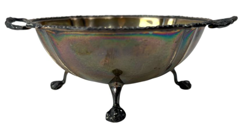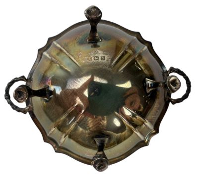 A 20th century George V hallmarked silver twin handled bowl raised on four claw and ball feet. Hallmarked year 1922, Birmingham. Sponsors mark for Adie Brothers Ltd. Weight approx 66g.