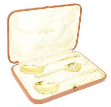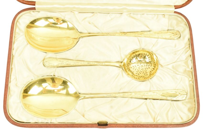 A cased set of three George III gilt hallmarked silver serving spoons. The lot to include two serving spoons. Hallmarked rubbed. Together with a sugar sifter spoon /pickle spoon. Hallmarked year 1782, London. Sponsors mark for JJ possible James Jones. Completed in a presentation box. Total weight approx. 204g.