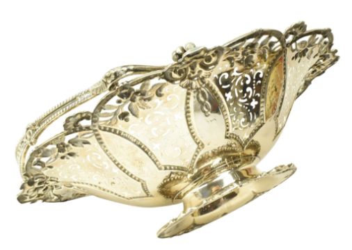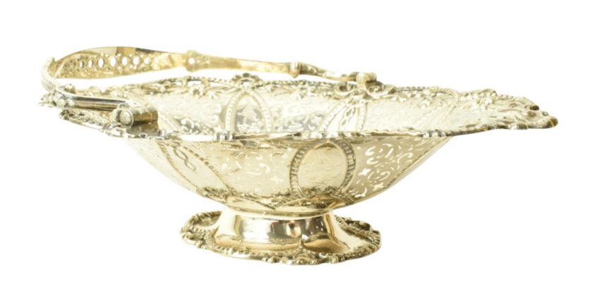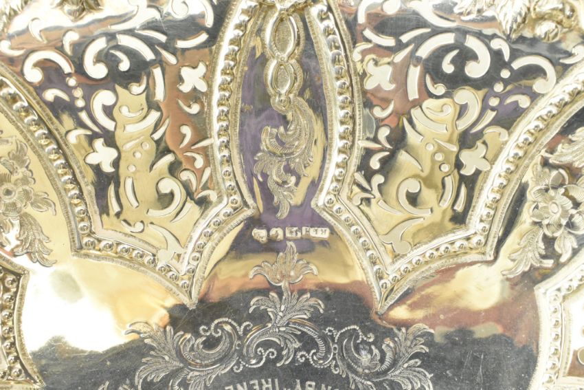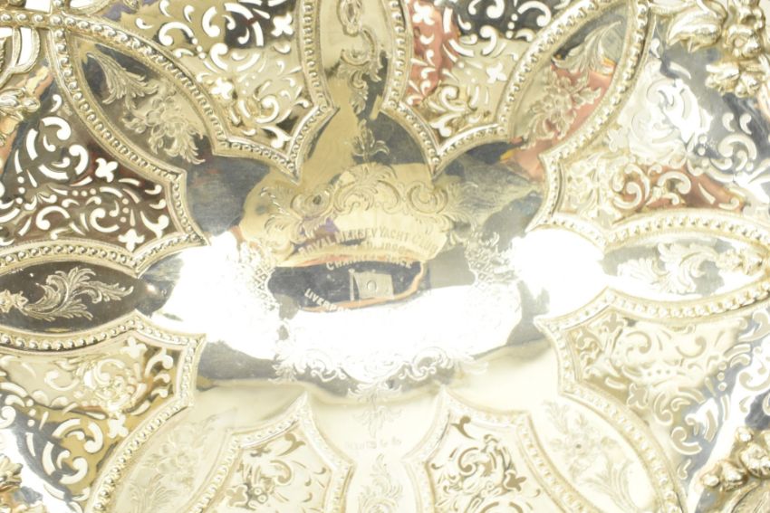 A Victorian hallmarked silver swing handled footed basket. The cake / fruit basket being decorated with ornate border having chased and pierced decoration. Engraved ' ROYAL MERSEY YACHT CLUB July 30 1898 Channel Race Liverpool to Llandudno 1 prize Won by Irene '. Sponsors mark for Roberts & Hall. Weight approx. 1047g.